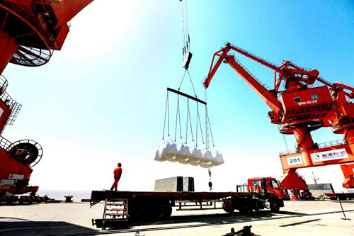 浙江嘉興港物流有限公司糧食碼頭上,貨物裝卸正忙碌有序地進行著。據介紹,獨山港經濟開發區碼頭貨物吞吐量達到466萬噸,同比增長17.94%,港口碼頭貨物吞吐量取得“大豐收”。碼頭貨物裝卸作業工人使用巨力吊索具吊運貨物,大大的節省人力勞動,提高工作效率,加快貨物裝卸工作。